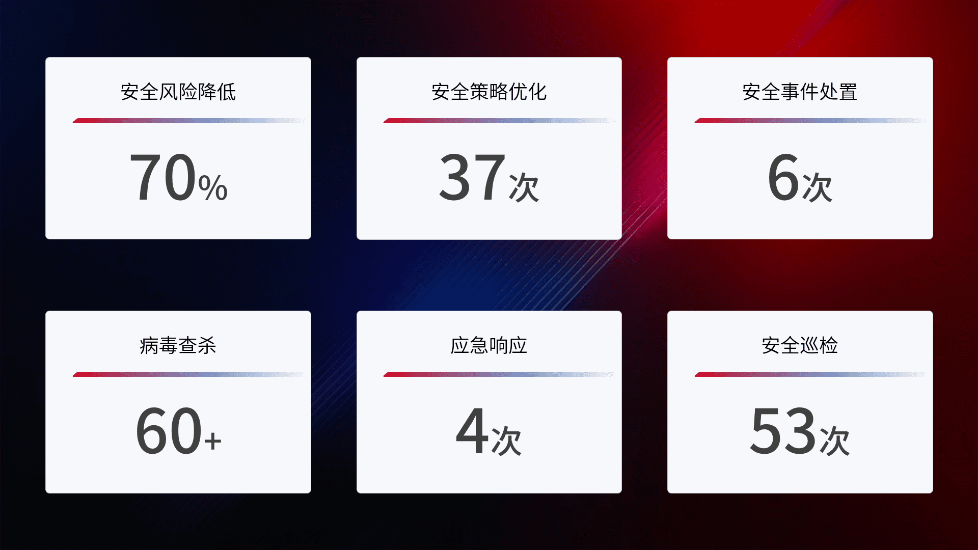 提供全面的安全事件报告体系,,,包括处置报告、、、、周报、、、季度和年度总结,,,结合持续监控,,帮助客户深入了解网络安全状况。。。